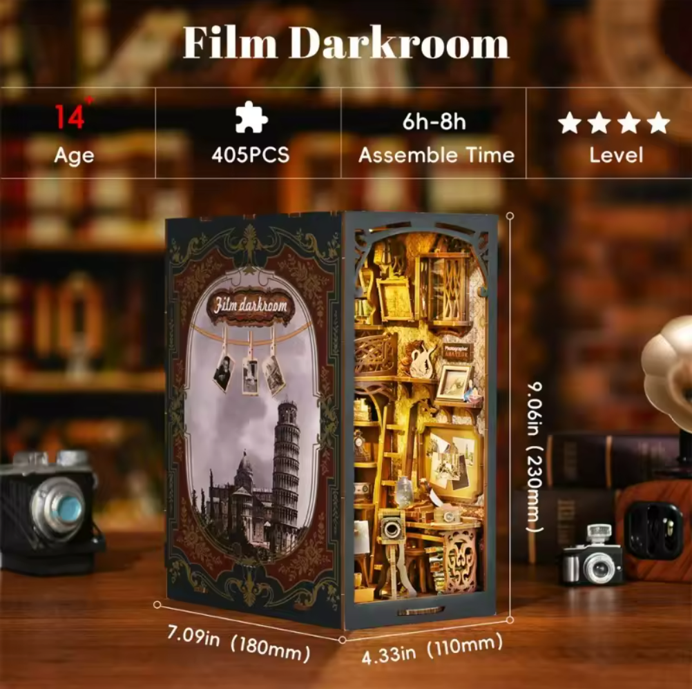 Step into the hushed world of film and darkroom magic with the Film Darkroom DIY Book Nook Kit. Inside, you’ll bring to life a beautifully detailed miniature studio filled with vintage cameras, film reels, development trays, and atmospheric red‑glow lighting that evokes the classic photographic darkroom.