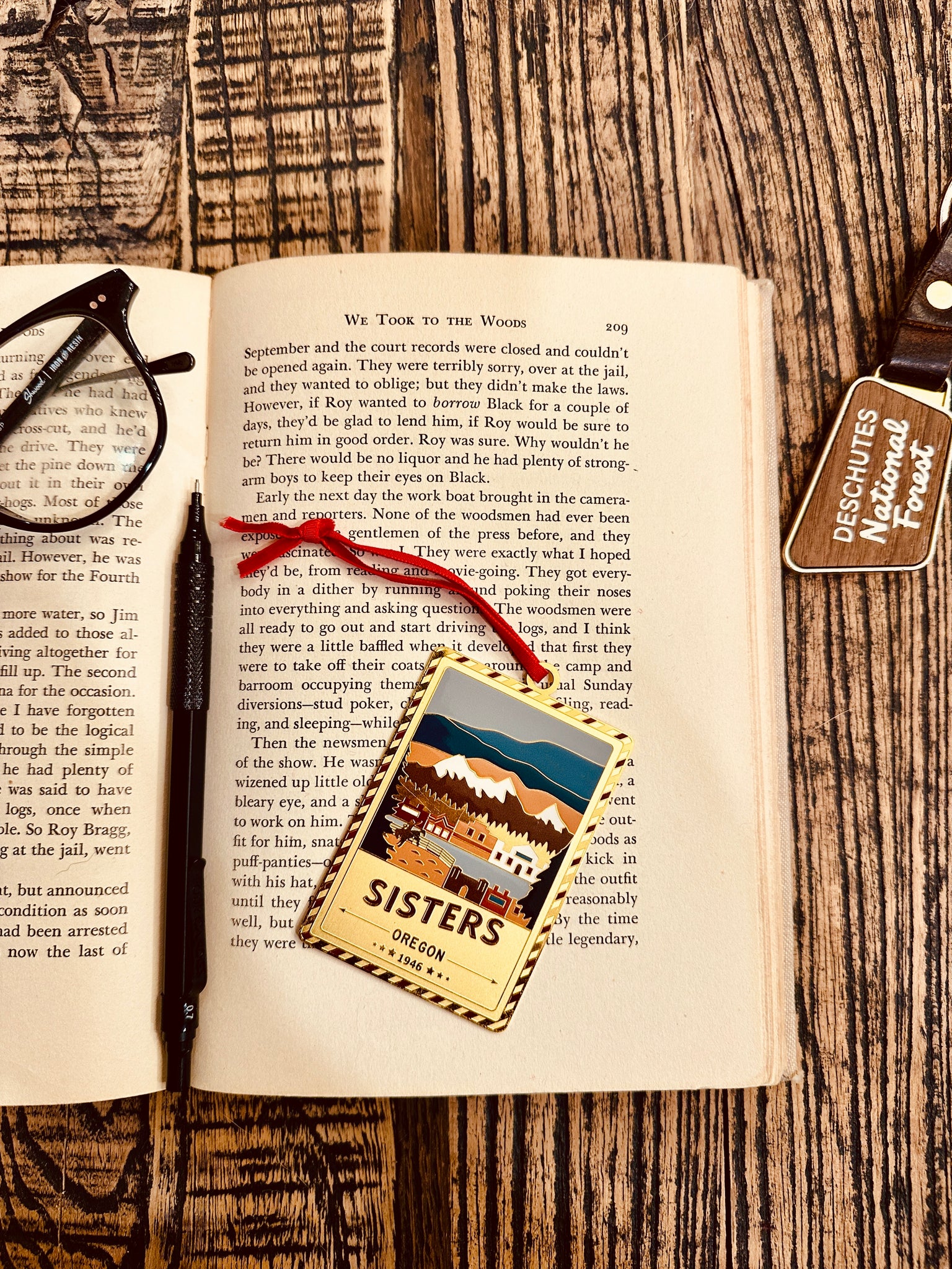 This elegant gold-finished metal postcard ornament beautifully captures the charm of Sisters, Oregon. Designed as both a keepsake and display piece, it showcases intricate details inspired by the town’s iconic Western-style architecture, stunning mountain backdrop, and welcoming small-town spirit. Durable yet lightweight, it features a shimmering metallic surface that reflects light, making it perfect for hanging on a holiday tree, displaying year-round, or gifting to loved ones. A timeless souvenir, this ornament is a lasting reminder of Sisters’ scenic beauty and warm community.