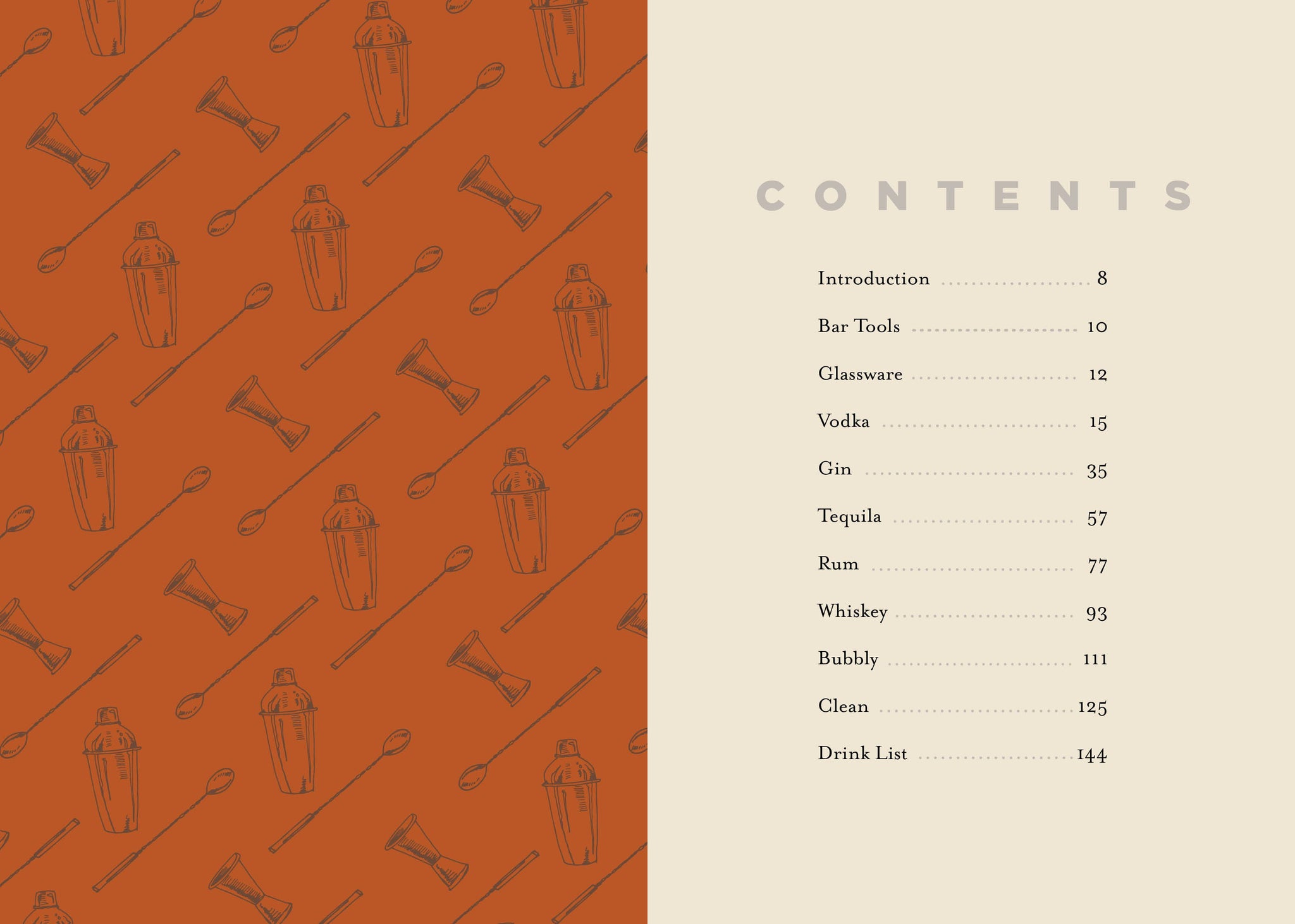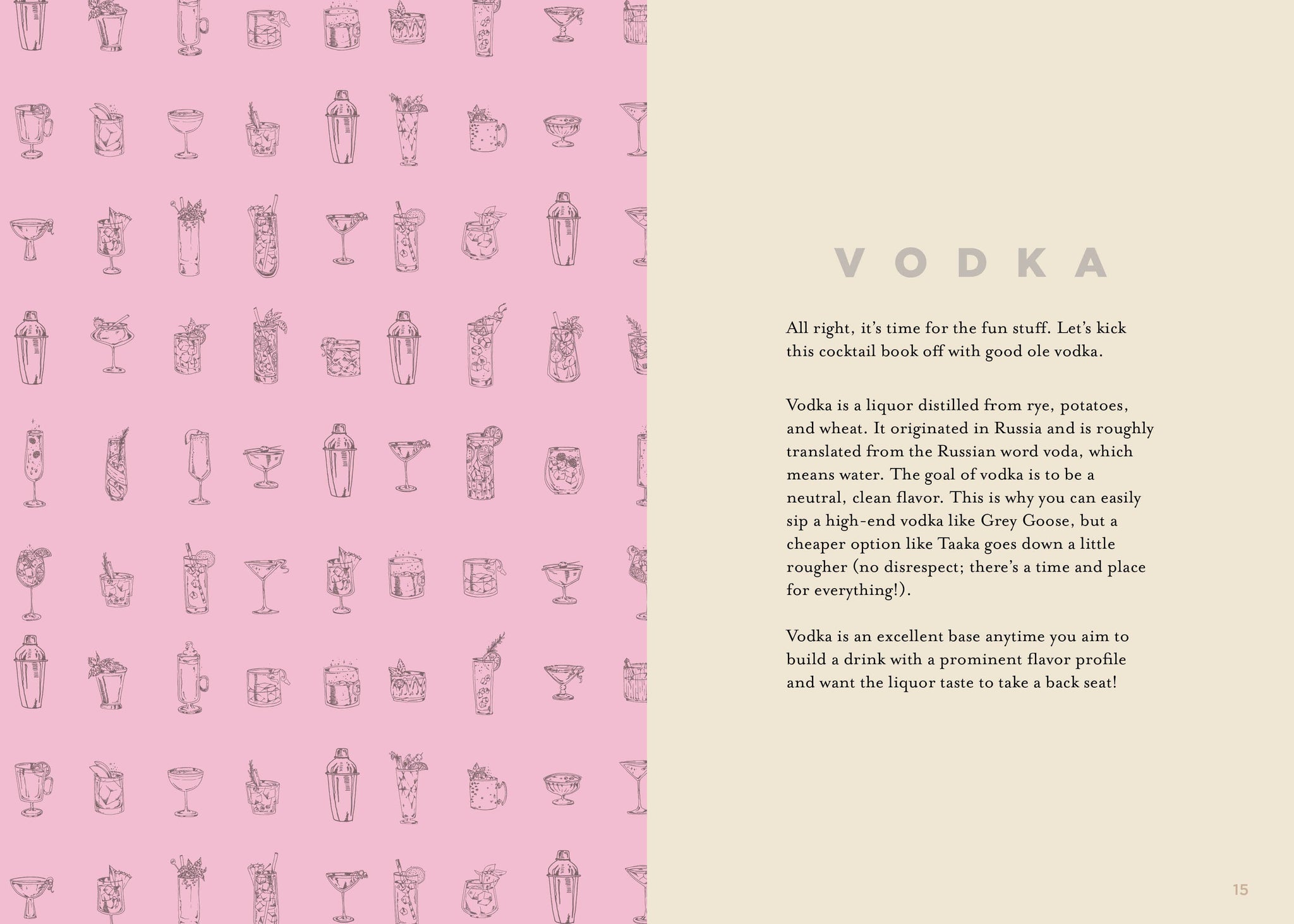 • chapters spotlighting vodka, gin, rum, tequila, bourbon, and sparkling wine
